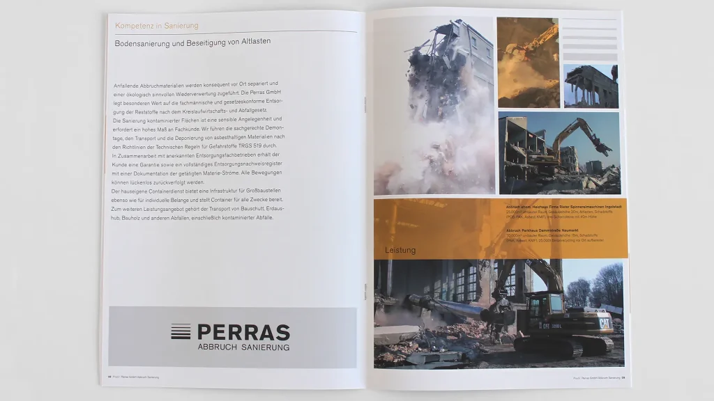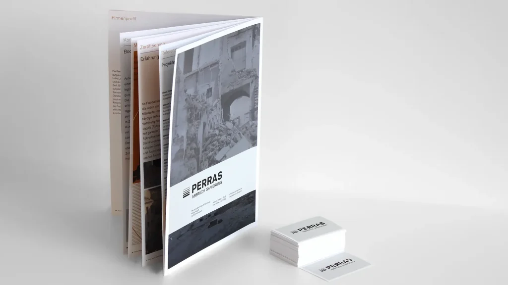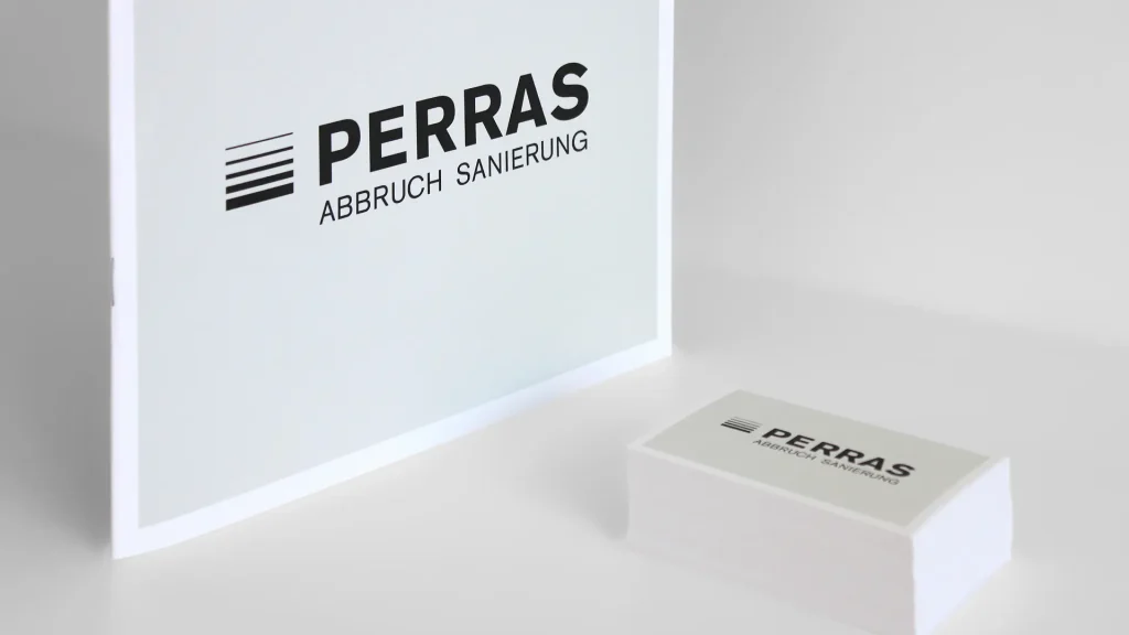 Die Perras GmbH ist Spezialist für Abbruch und Sanierung. Zur Kommunikation der breiten Gewerke dient ein durchgängiges Erscheinungsbild, eine visuelle Sprache, die für die administrative Geschäftsausstattung genauso geeignet ist, wie für den Einsatz auf der Baustelle.