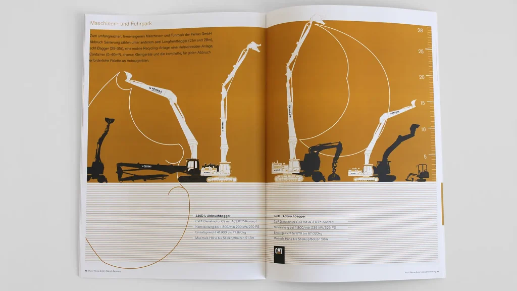 markelos entwickelt und gestaltet diesem Erscheinungsbild folgend alle Kommunikationsmittel wie Briefbogen und Visitenkarte, Formularsätze für Baustellen- und Regieberichte mit Durchschlagpapier sowie Stempel. Eine hochwertige Publikation zur Firmendarstellung und Vermittlung der Kompetenz in Abbruch und Sanierung zeigt in ausdrucksstarken Bildern den für das Unternehmen sehr wichtigen Fuhrpark sowie aussagekräftige Referenzen.